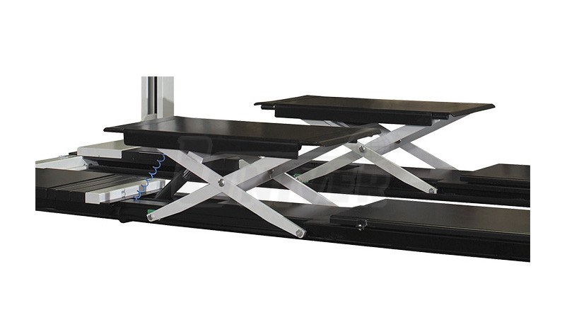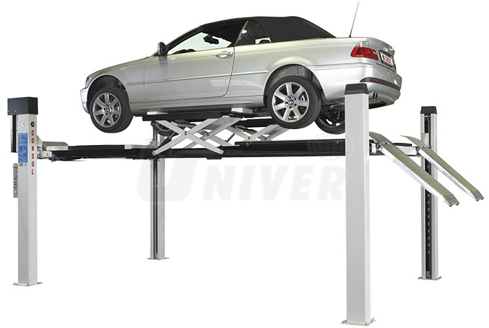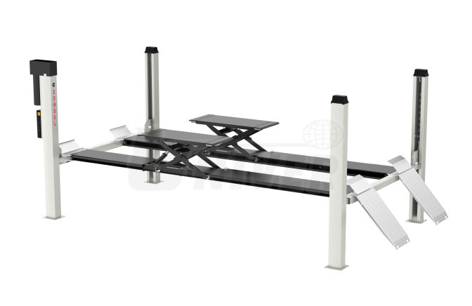 Čtyřsloupový elektrohydraulický kompaktní zvedák (4500 kg) s plošinami (4440 mm) a přídavným oboustranným nůžkovým zvedákem.- velmi nízká konstrukční výška ve spuštěném stavu