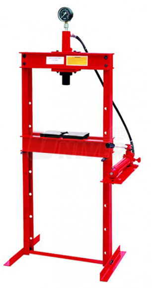 Stojanový hydraulický lis (12 t) s ručním ovládáním hydraulické jednotky a kontrolním tlakoměrem.- nastavitelný pracovní stůl / lisovací lože (7 poloh)