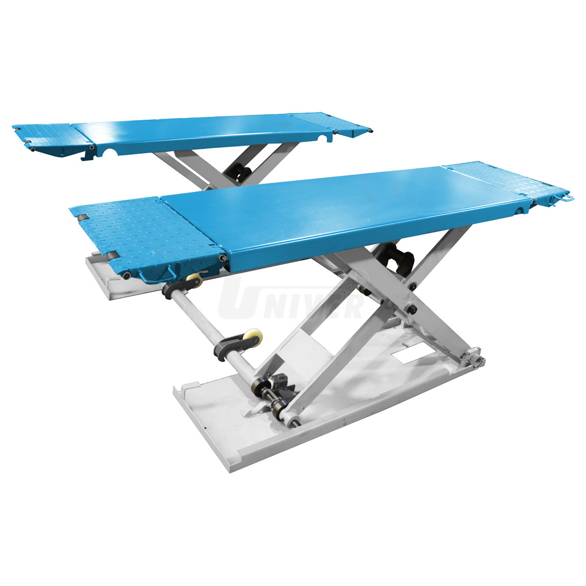 zvedák má dva spodní rámy, které jsou na podlaze, nůžkovou zvedací konstrukci se dvěma hydraulickými jednotkami, dvě nosné plošiny a oddělenou pojízdnou ovládací jednotku / skříň s ovládacím panelem, obě plošiny mají na obou koncích nájezdové plošinky