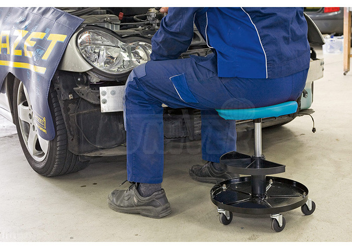 Čalouněné pracovní sedátko robustního provedení pro univerzální použití v průmyslu, v opravárenských provozech, v autoservisech apod..