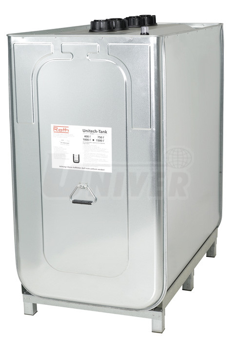 1000 l ocelový plech, žárově zinkovaný HDPE (polyetylén vysoké hustoty) 4 x G 2" vnitřní, sudové šroubení 1280 x 760 x 1420 94 kg |