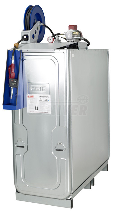 Dvouplášťová stacionární nádrž 1500 l na oleje s elektrickým čerpadlem 230 V, s navijákem, výdejní hadicí 10 m a s pistolí s digitálním průtokoměrem.- dvouplášťová stacionární nádrž o objemu 1500 l (45 105)
