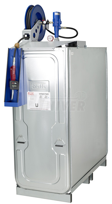 Dvouplášťová stacionární nádrž 1500 l na oleje s pneumat. čerpadlem 3:1, s navijákem, výdejní hadicí 10 m a s pistolí s digitálním průtokoměrem.- dvouplášťová stacionární nádrž o objemu 1500 l (45 105)