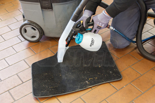 Rotační pneumatická čisticí pistole se zásobníkem čisticího prostředku 1 l.- praktická a účinná rotační čisticí pistole se osvědčila např. při čištění čalounění, koberců apod. s použitím vhodného čisticího prostředku v zásobníku o objemu 1 l