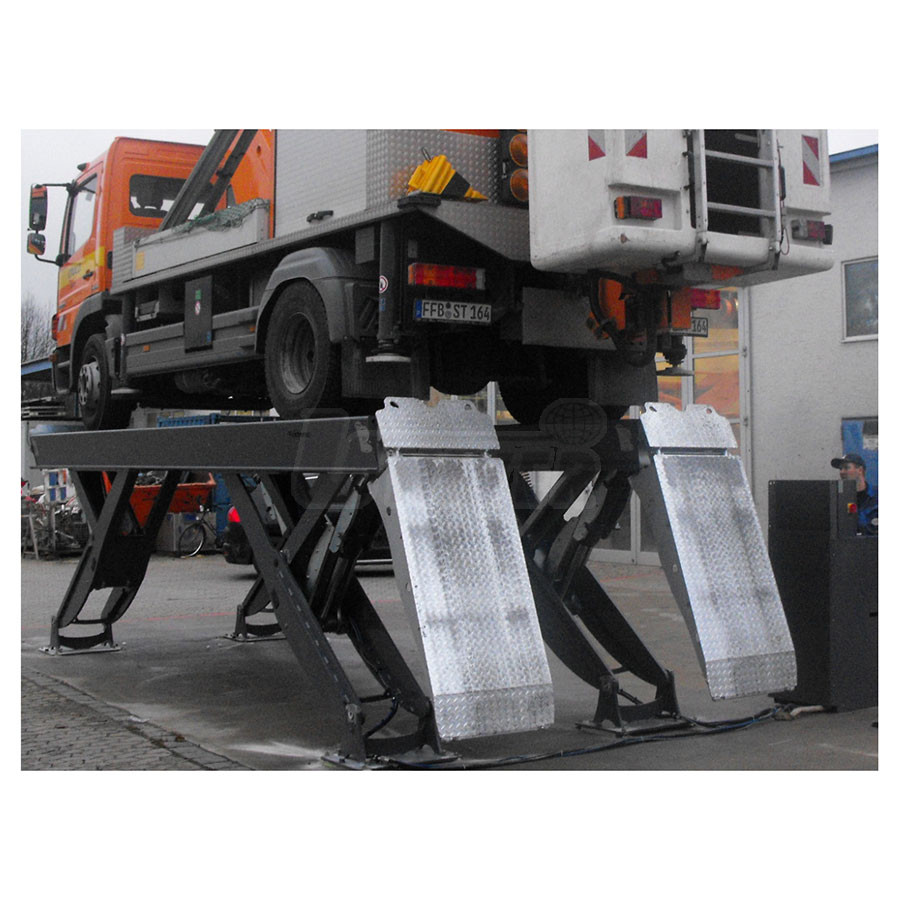 Elektrohydraulický plošinový zvedák polonůžkový (Y-tec) s nosností 25 t / 36 t s plošinami délky 8000 mm pro zvedání i těžkých užitkových automobilů..- nosnost 25 t, příp. 36 t při symetrickém zatížení, se 2 zvedacími plošinami délky 8000 mm