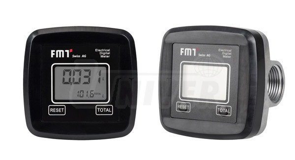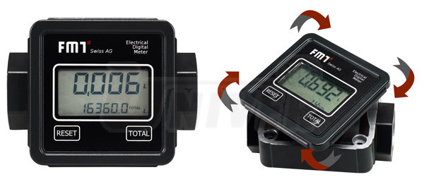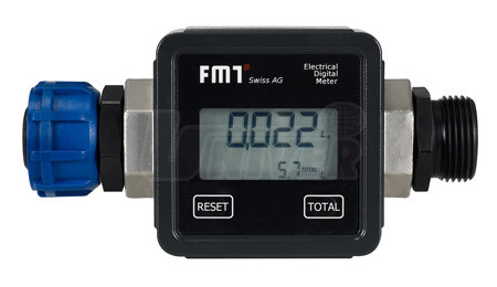 Digitální průtokoměr pro AdBlue, čtyřmístný, s turbinovým počítadlem z ušlechtilé oceli, materiál: kryt počítadla – ušlechtilá ocel, turbína – POM (acetalhomopolymer), těsnění – NBR 70, připojovací armatura oboustranná G 1" vnitřní, není kalibrovatelný.