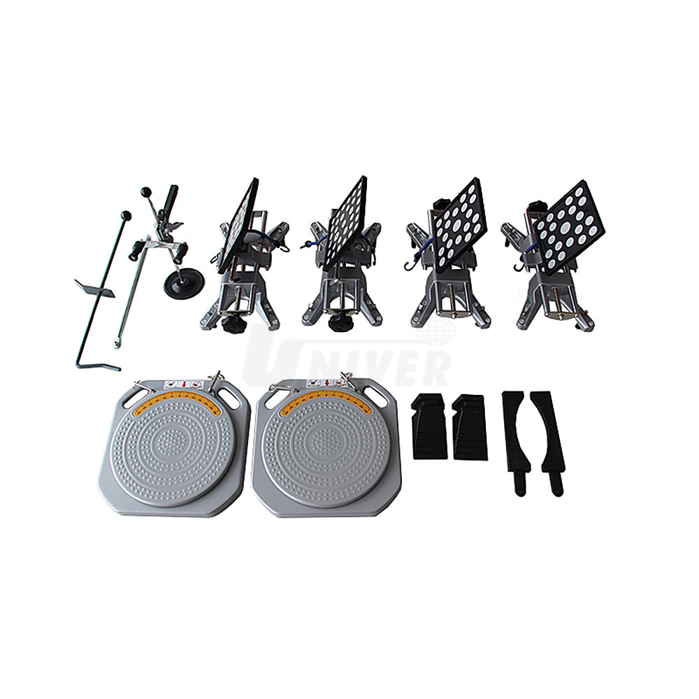 - malé odrazové terče (pasivní snímače) s držáky pro snadné a bezpečné upnutí na disky kol, nepotřebují žádnou vestavěnou elektroniku, žádné napájení, mechanické libely, ani kalibraci, a navíc jsou v dílenském nasazení téměř nerozbitné