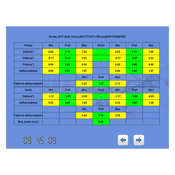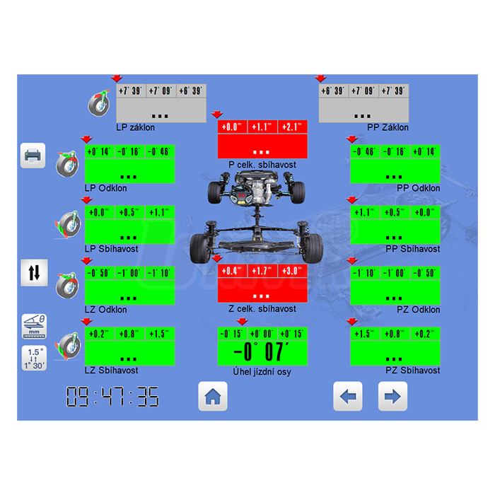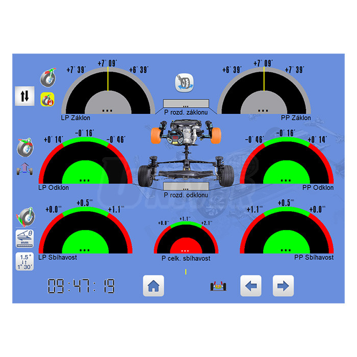 - celková sbíhavost a dělená sbíhavost, odklon kola, záklon, příklon, úhel jízdní osy, diferenční úhel rejdu, přesazení kol a řada dalších, doplňkových měření, intuitivní a snadno použitelné uživatelské rozhraní