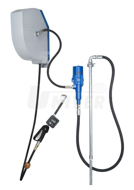 Sestava s pneumatickým čerpadlem 3:1 pro čerpání motorových, převodových a hydraulických olejů ze sudů 200/220 l je vybavena uzavřeným samonavíjecím bubnem a výdejní pistolí s digitálním průtokoměrem.Výbava a základní parametry: