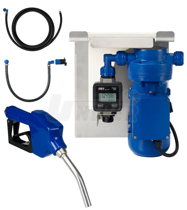 Sestava na sud s elektrickým membránovým čerpadlem 230 V pro AdBlue a vodu, s deskou pro instalací na sud, se sací hadicí, s automatickou výdejní pistolí a s digitálním průtokoměrem.- sestava pro instalaci na sud s elektrickým samonasávacím membránovým čerpadlem s automatickou výdejní pistolí a s digitálním průtokoměrem, sací bod nahoře