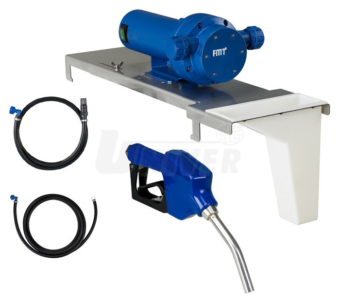 Sestava na sud s elektrickým samonasávacím membránovým čerpadlem 24 V pro AdBlue a vodu, s deskou pro instalací na sud, se sací hadicí a s automatickou výdejní pistolí.- sestava pro instalaci na sud s elektrickým samonasávacím membránovým čerpadlem s automatickou výdejní pistolí