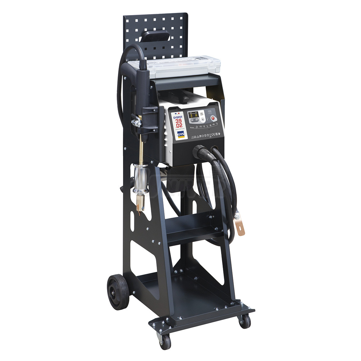 Základní souprava pro opravy ocelových karosérií se spotovacím přístrojem GYSPOT 39.02, s vozíkem, s vytahovacím můstkem a sadou navařovacích materiálů.- mikroprocesorem řízený přístroj se 75 integrovanými nastaveními pro vyrovnávání ocelových karosérií se zdvojenými stěnami