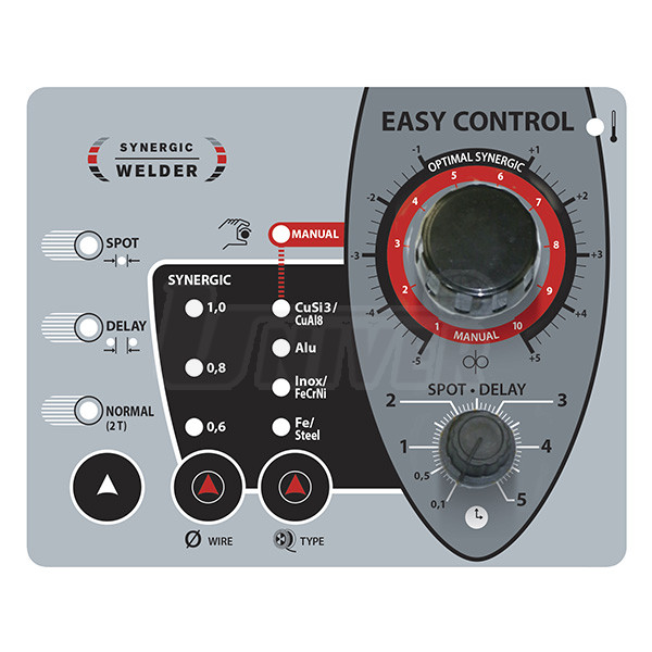 - obsluha si zvolí buď manuální modus, kdy se musí nastavit rychlost posuvu drátu nebo synergický modus, který umožňuje optimální svařování bez nastavování rychlosti posuvu drátu, nastavují se jen 3 parametry: druh drátu, průměr drátu a výkon, přístroj si zvolí optimální rychlost posuvu drátu automaticky