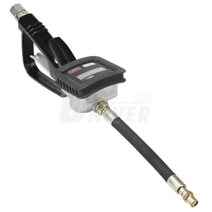 Plnicí / výdejní pistole na olej s digitálním průtokoměrem 0 – 30 l / min, aluminiovou skříní, přímým hadicovým nástavcem a otočným kloubem.- plnicí / výdejní pistole na motorový olej SAE 5 až 50 a převodový olej SAE 80 až 240 s přímým hadicovým nástavcem