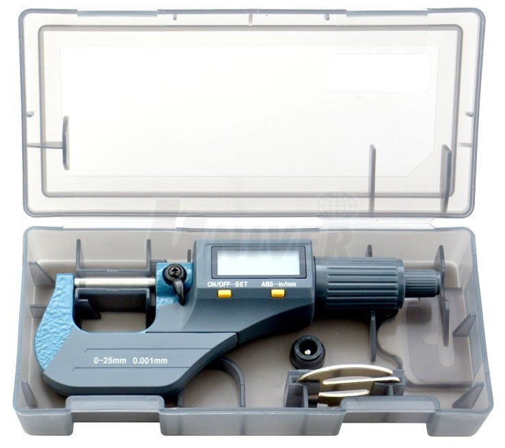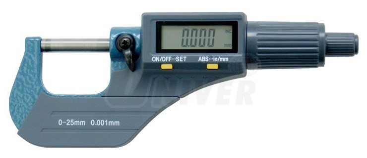 Digitální třmenový mikrometr pro přesné měření vzdáleností.- LCD displej s velkými číslicemi (8 mm)