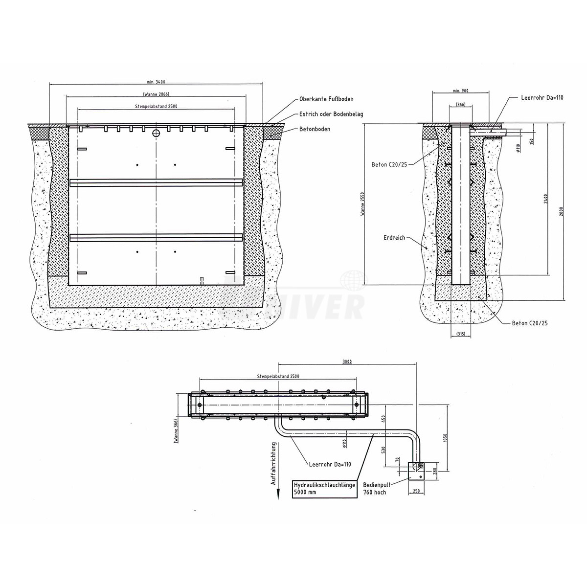 Dvoupístový hydraulický podpodlažní zvedák s nosností 3,5 t, se vzdáleností pístních jednotek 2500 mm, s 3-dílnými otočnými a délkově nastavitelnými nosnými rameny.- vodicí i opěrný píst tvrdě pochromované