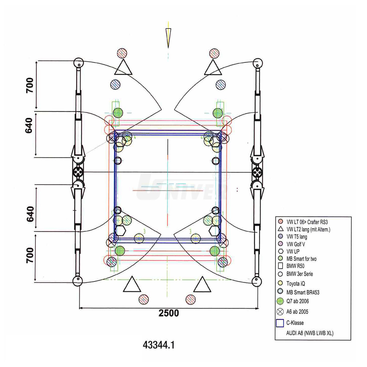 433441 – nosná část s výkyvnými 3-dílnými rameny, 2-násobně teleskopickými, aretace nosných ramen, nosné talíře z tvrdé gumy a profilem, lze je vyšroubovat o cca 30 mm, upevňovací materiál, vhodné konstrukční provedení pro zvedání malých i velkých osobních automobilů a transportérů (např. VW T5)