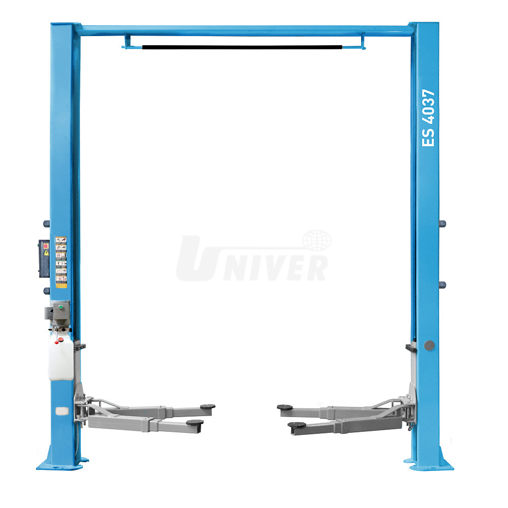 Elektrohydraulický dvousloupový asymetrický zvedák bez spojovacího prahu mezi sloupy s nosností 4000 kg a s elektromagnetickým odjištěním západek.- dvousloupový elektrohydraulický asymetrický zvedák s horním propojením sloupů, bez spodního spojovacího prahu