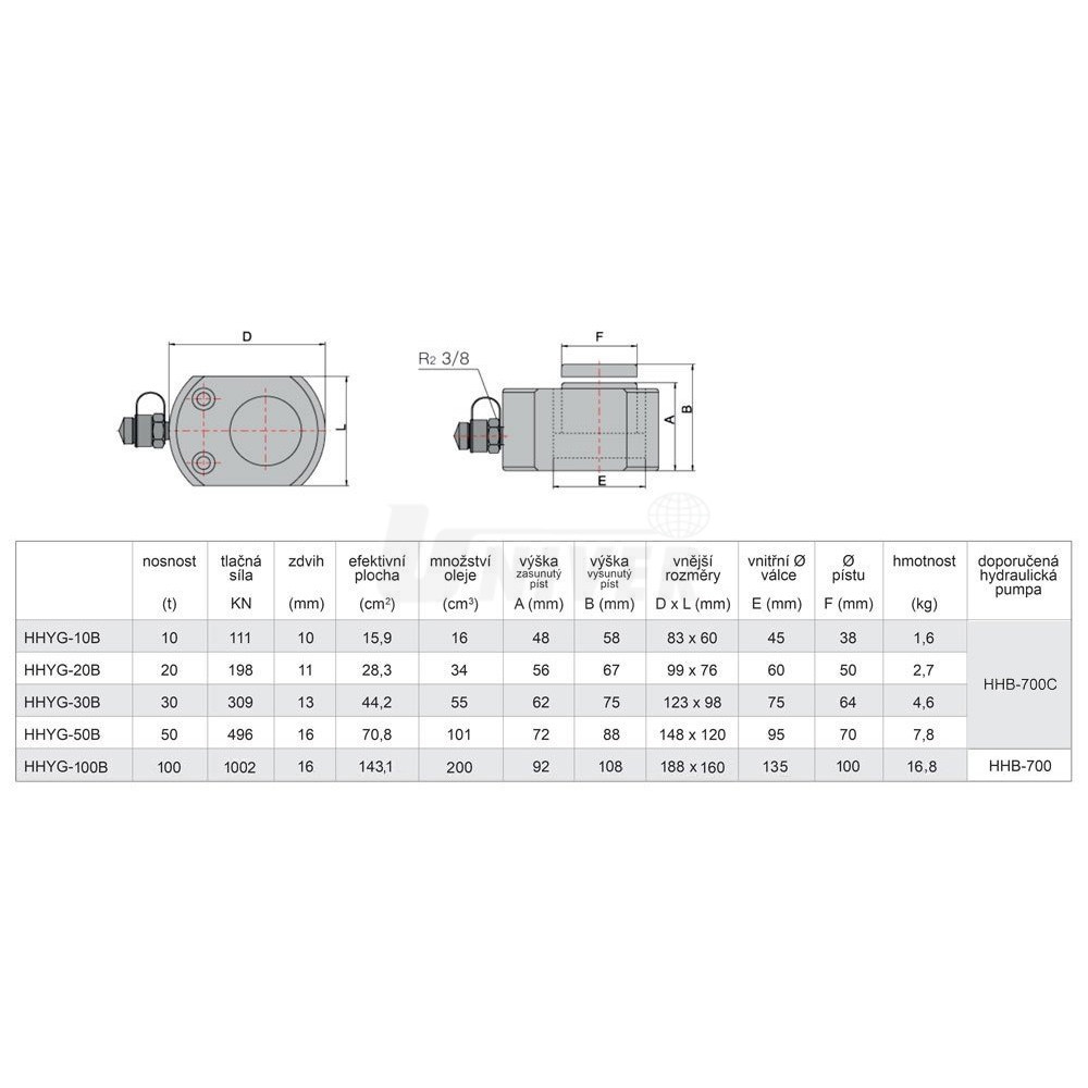 - jako zdroj tlaku se doporučuje ruční hydraulická pumpa HHB-700C nebo obdobná
