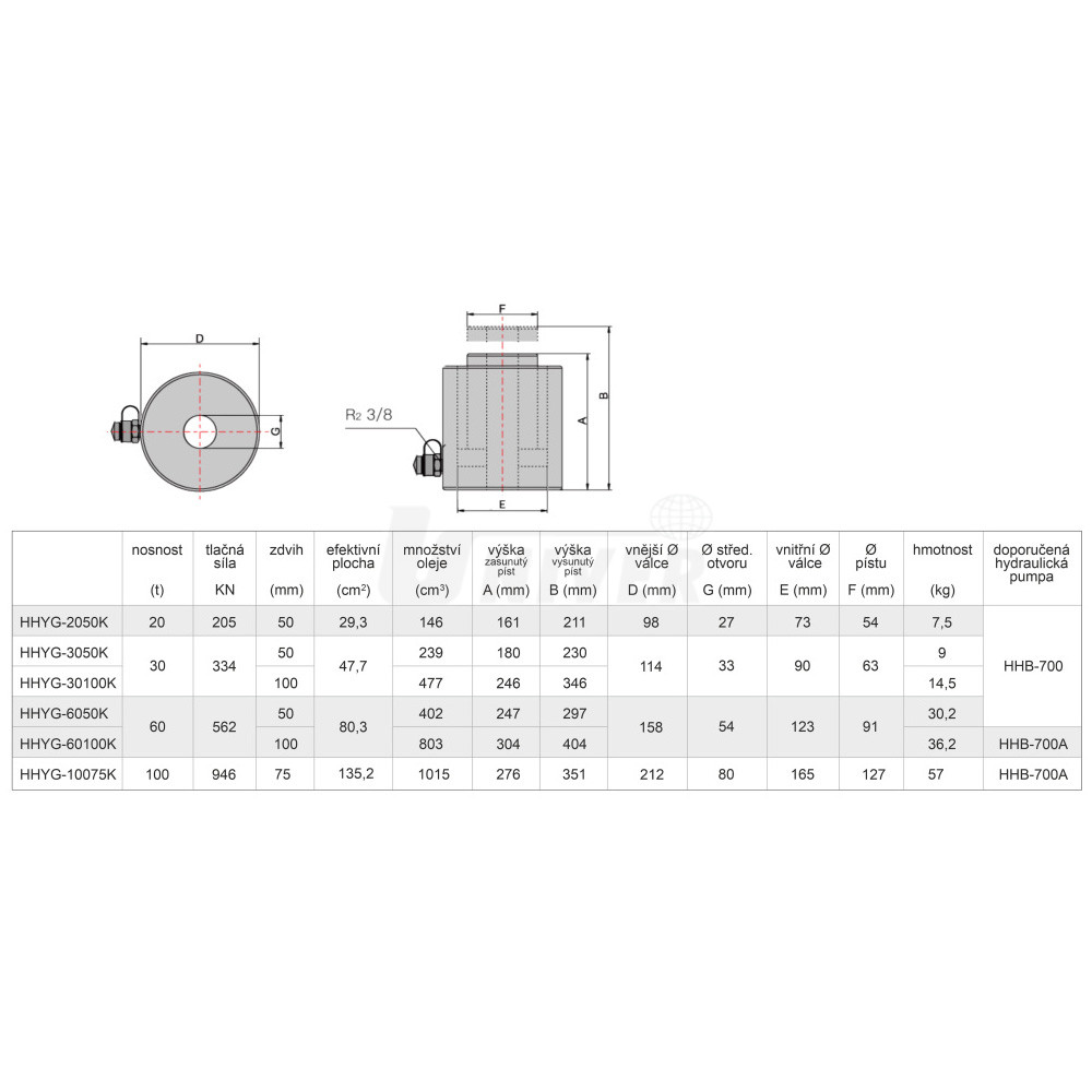 - jako zdroj tlaku se doporučuje ruční hydraulická pumpa HHB-700 / HHB-700A (z naší nabídky) nebo obdobná hydraulická pumpa