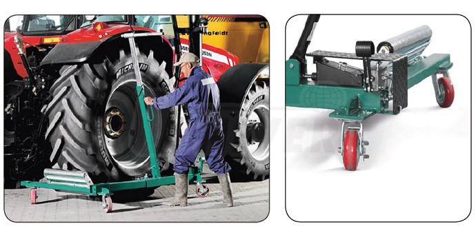 Hydraulický transportní a montážní zvedák pro kola zemědělských a stavebních strojů.- hydraulický zvedák o nosnosti 1,6 t pro převážení, montáž a demontáž velkých kol zemědělských a stavebních strojů o průměru kol od 1250 mm až do 2400 mm a šířky až do 1050 mm