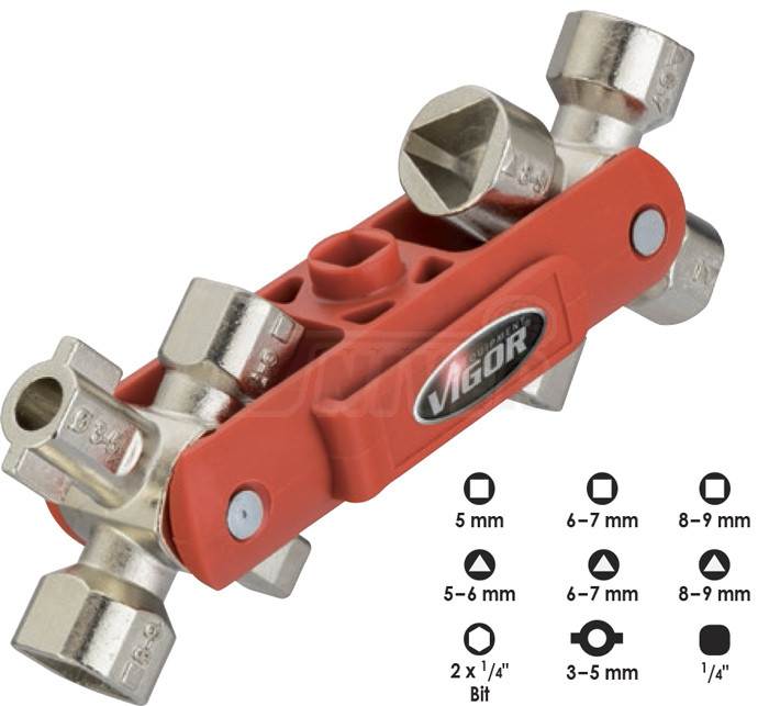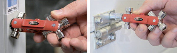 Multifunkční klíč pro ovládání uzávěrů z oblasti techniky budov (rozvodné skříně, sanitární zařízení atd.).- účelný a univerzální pomocník při otevírání/zavírání různých uzávěrů topení, sanitární techniky, klimatizační a větrací techniky, ale i uzávěrů pouličních lamp, kontejnerů na odpadky atd.