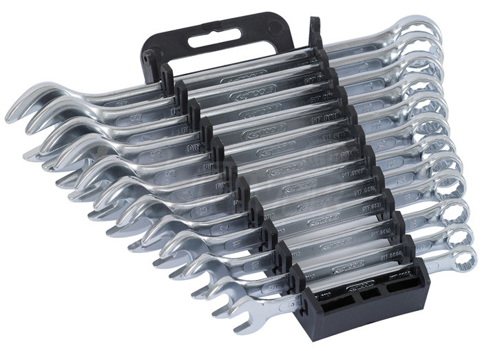 12-dílná sada očkoplochých klíčů profilu Flank Traction o velikosti 8 až 19 mm z kvalitního chrom-vanadia.- jak rozvidlení, tak očko jsou vyhnuté v úhlu 15°