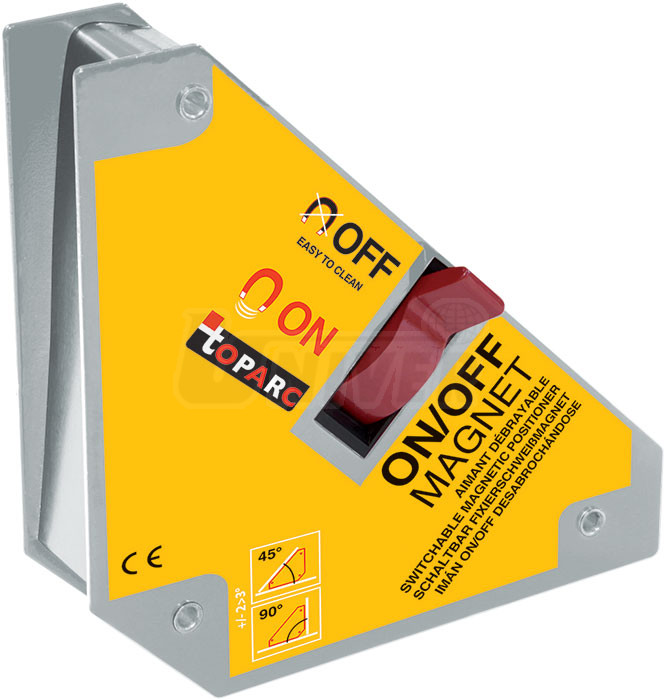 Úhelník s permanentním magnetem s vypínačem slouží k fixaci/zajištění kovových dílů při svařování, vrtání, nýtování apod. v rohových úhlech 45°, 90° a 135°.