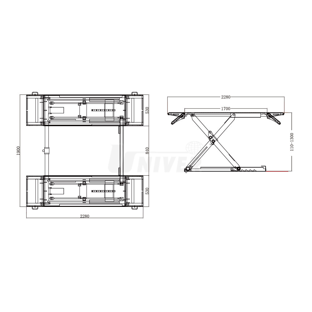 nízkoprofilový model, ve spuštěném stavu je jen 110 mm nad podlahou, najíždět na něj lze v případě potřeby z obou směrů, a to i automobily s nízkou světlou výškou nad podlahou / vozovkou