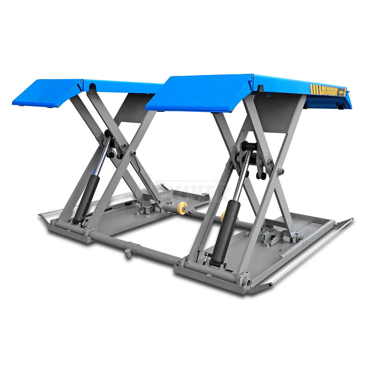 zvedák má dva spodní rámy, které jsou na podlaze, nůžkovou zvedací konstrukci se dvěma hydraulickými jednotkami, dvě nosné plošiny a oddělenou pojízdnou ovládací jednotku / skříň s ovládacím panelem, obě plošiny mají na obou koncích nájezdové plošinky