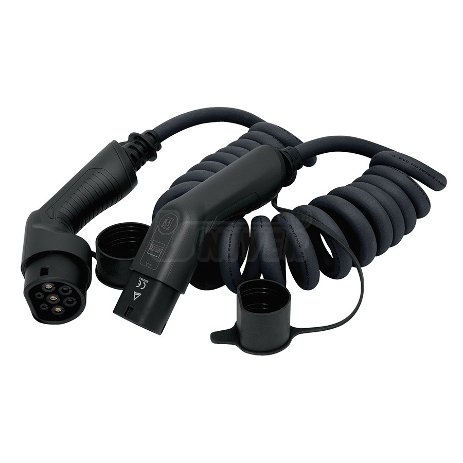 Spirálový kabel pro připojení elektromobilu k nabíjecí stanici se zástrčkami Typ 2, až do 7,36 kW, 230 V, jednofázový, 32 A, režim 3.- spirálový nabíjecí kabel zůstává stále napnutý, takže se během použití nedotýká podlahy