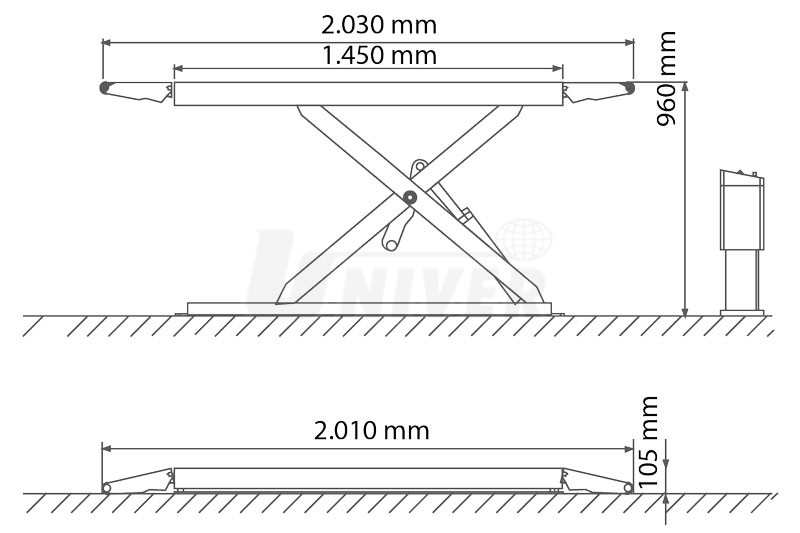 Nůžkový elektrohydraulický nízkozdvižný / stacionární zvedák s nosností 3 000 kg s délkově nastavitelnými plošinami a velmi nízkou konstrukcí pro instalaci na podlahu.