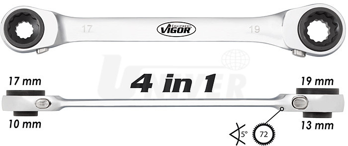 Oboustranný ráčnový klíč (4 v 1) má na jedné straně ráčnové klíče 10 mm a 17 mm a na straně druhé 13 mm a 19 mm. Očkově přepínatelné ráčny z kvalitního chrom-vanadia mají 72 zubů , délku 220 mm. Klíč je určen pro náročné použití zejména v obtížně přístupných místech (otočný úhel 5°).
