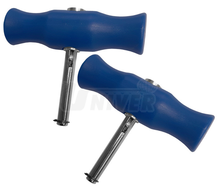 Sada 2 přípravků pro tažení vyřezávacího drátu se samojistícím uchycením.- drát se protáhne skrz povytažený dřík, znovu protáhne koncem dříku a natočí zpět do pouzdra rukojeti, přičemž se stlačením koncového klínu zpět do rukojeti pevně zajistí