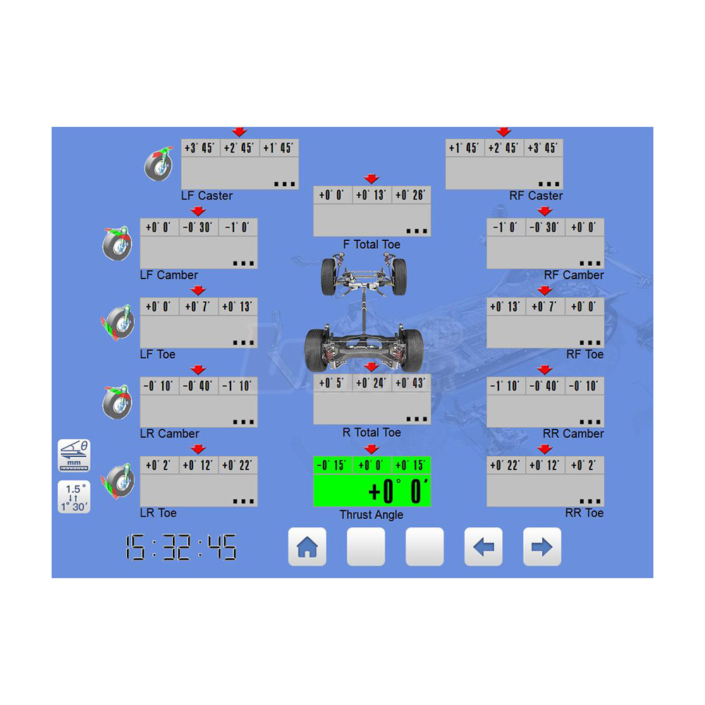 - celková sbíhavost a dělená sbíhavost, odklon kola, záklon, příklon, úhel jízdní osy, diferenční úhel rejdu, přesazení kol a řada dalších, doplňkových měření, intuitivní a snadno použitelné uživatelské rozhraní