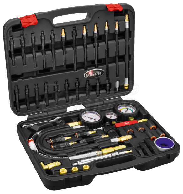 - v sadě v plastovém kufru je tlakoměr 0 - 50 bar s vysokotlakou pryžovou hadicí opatřenou vypouštěcím ventilem, umožňujícím opakování měření komprese stejného válce bez vyšroubování koncovky