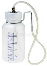 3-0070 - záchytná plastová láhev 1,5 l s odměrnou stupnicí, s víčkem, hadičkou a koncovkou na odvzdušňovací šroubky brzd a s nerezovým zavěšením