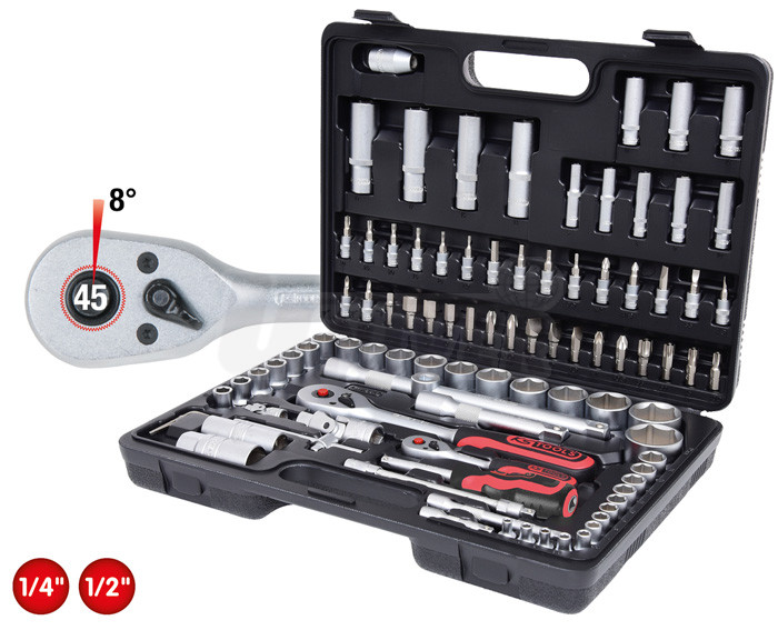 96-dílná sada nástrčných klíčů 1/4" a 1/2" (chrom-vanadium) profilu FlankTraction v plastovém kufříku.- materiál: chrom-vanadium