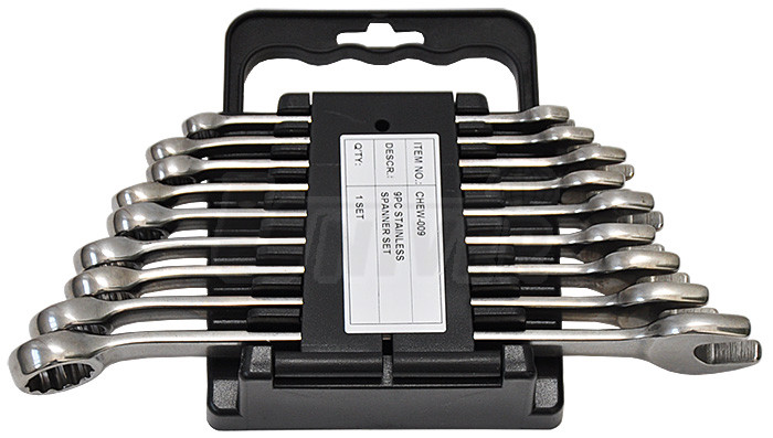 Sada očkoplochých klíčů (na jedné straně přímých otevřených, na druhé straně očkových s vyhnutím 15°), které jsou vyrobeny z vysoce kvalitní nerezové oceli (INOX). Vynikají mechanickou odolností a dlouhou životností. Výborně se hodí pro práci např. v extrémně vlhkém prostředí, v častém a delším kontaktu s vodou, chemikáliemi apod., kdy klasické klíče dříve či později zkorodují.Obsah 9-dílné sady v plastovém závěsném držáku: