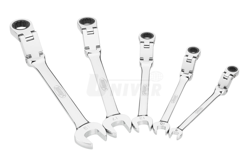 5-dílná sada očkoplochých ráčnových klíčů s dvojitým kloubem (8-19 mm) a s přepínatelnou ráčnou se 72 zuby z kvalitní chrom-vanadiové oceli.- používají se s výhodou tam, kde je aplikace klasických klíčů z důvodu omezeného prostoru pro pootočení klíče vyloučená