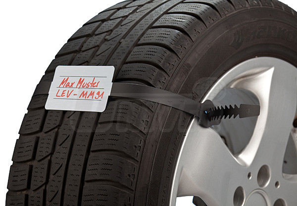 Plastová visačka s identifikačním štítkem na kola a se zdrhovací páskou pro označování kompletních kol při sezónním skladování.- plastová visačka s identifikačním štítkem na kola a se zdrhovací páskou pro označování kompletních kol při jejich skladování