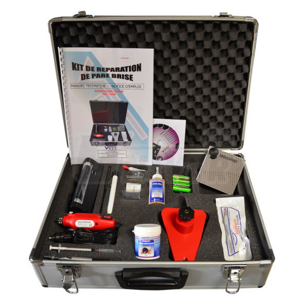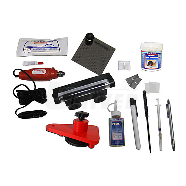 1 ks aluminiový kufřík 1 ks PVC můstek / držák vstřikovače s plunžrem pro aplikaci pryskyřice 1 ks UV-lampa 12 V s časovým spínačem na vytvrzování opravné pryskyřice 1 ks těsnicí mazivo na přísavky 1 ks pomocné kontrolní zrcátko s přísavkou 1 ks tužková svítilna 1 ks lešticí pasta 60 ml 1 ks amplule opravné/vyplňovací pryskyřice (stačí na 5 až 8 oprav) 1 ks minivrtačka / leštička 12 V 1 ks karbidový bit do vrtačky / leštičky 1 ks speciální přípravek / pero s karbidovou špičkou 5 ks seškrabovacích žiletek 1 ks ampule speciální dokončovací pryskyřice (stačí pro více než 60 oprav) 10 ks čtverečků mylarové fólie 1 ks dlouhá jehla / sonda |