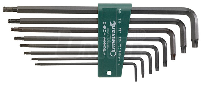 8-dílná sada dlouhých úhlových šroubováků TORX s kulovou hlavou.- nejvyšší kvalita garantovaná renomovanou značkou Stahlwille, vyrobeno v Německu