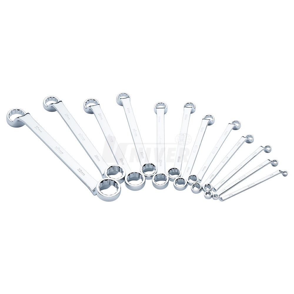 Sada (12 ks) vyhnutých očkových klíčů z kvalitního chrom-vanadia pro profesionální, náročné použití.- vnější zdvojený šestihranný profil