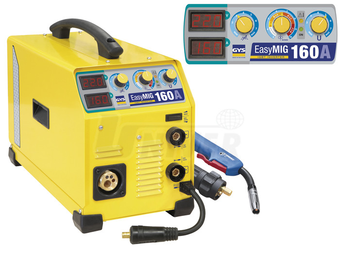 230 V / 50 Hz 16 A 20 – 140 A 30 – 160 A Ø 0,6 – 0,8 mm Ø 0,9 mm Ø 100 mm (1 kg), Ø 200 mm (5 kg) Ø 1,6 – 3,2 mm 95 A / 60 %, 160 A / 20 % 90 A / 60 %), 140 A / 20 % 400 x 200 x 330 mm 10,1 kg |