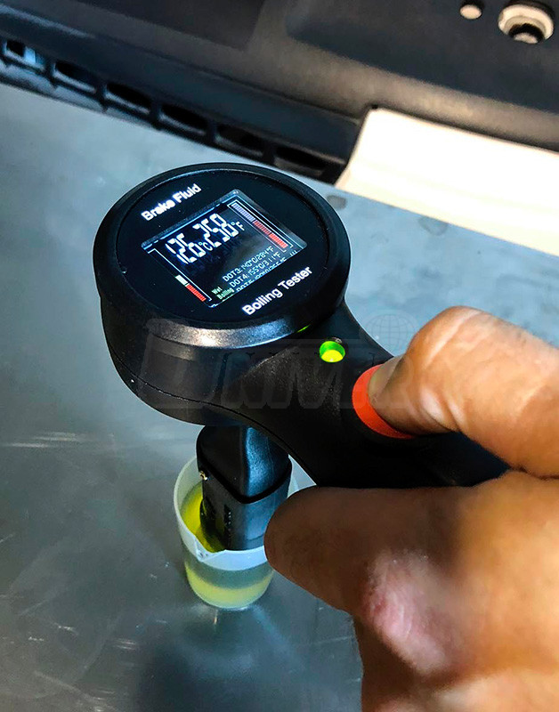 Digitální přístroj pro zkoušení všech brzdových kapalin (DOT3, DOT4, DOT5.1) změřením jejich bodu varu, který je indikován na digitálním displeji, je napájený z baterie 12 V.- precizní digitální tester brzdových kapalin specifikací DOT3, DOT4 i DOT5 a to přímým změřením jejich bodu varu, který je daný druhem brzdové kapaliny a obsahem vody v ní