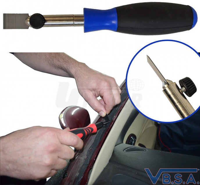 Univerzální škrabka vysoké kvality se používá k seškrabování staré polyuretanové housenky lepeného skla.