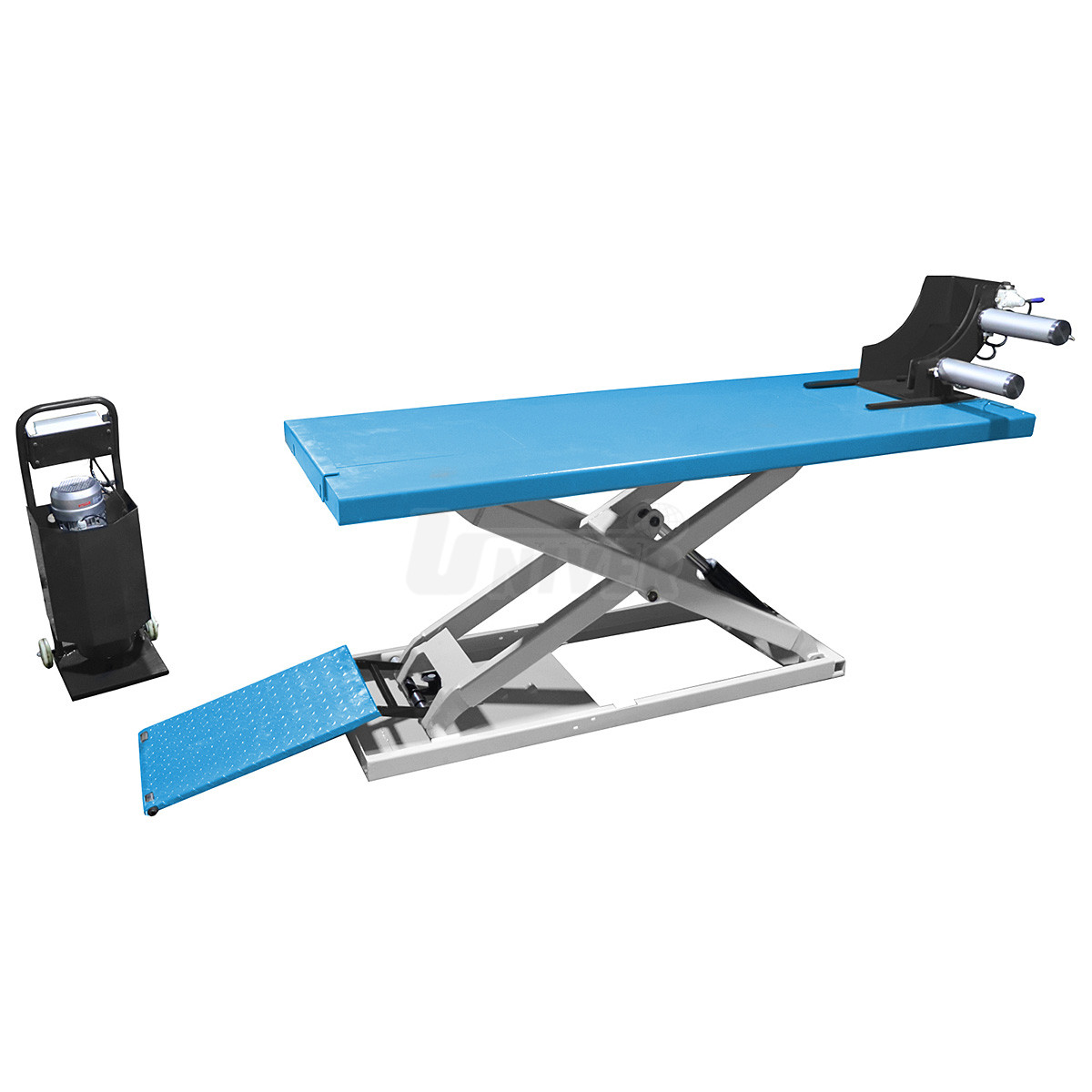 Elektrohydraulický plošinový zvedák s nůžkovou zvedací konstrukcí o nosnosti 1 000 kg se separátní ovládací a pohonnou skříňkou.- elektrohydraulický nůžkový plošinový zvedák pro motocykly s nosností 1000 kg
