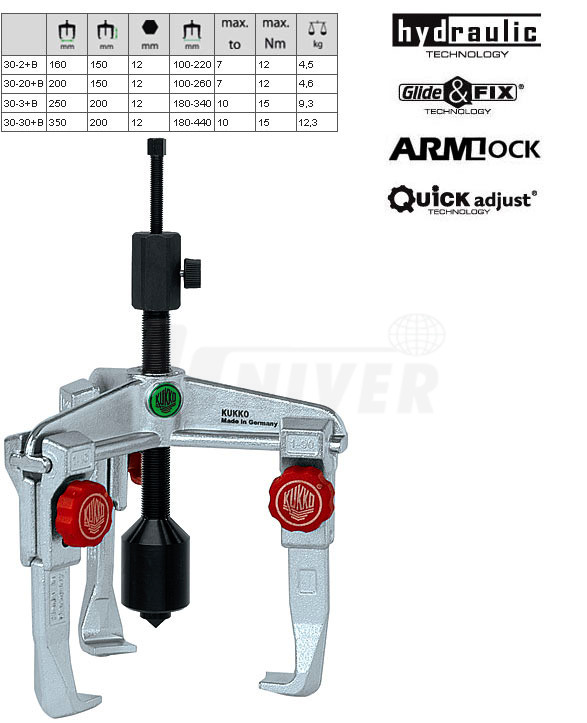 3-ramenné hydraulické stahováky s posuvnými háky se systémem Quick adjust (rychle se nastavující háky) německé firmy KUKKO-Werkzeugfabrik patří do nejvyšší kvalitativní třídy v Evropě.Vlastnosti: