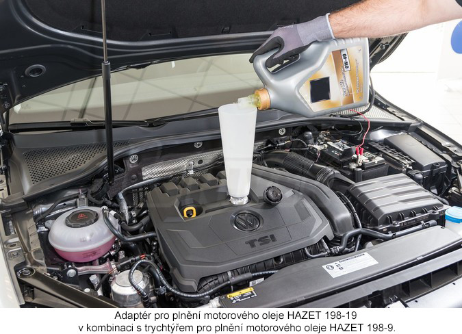 objem 1 l, zajišťuje u některých motorů nezbytné pomalé, kontrolované plnění motorového oleje, s volitelným úhlovým spojovacím adaptérem HAZET 198-12 vhodné i pro obtížně přístupné plnicí otvory oleje, umožňuje kombinaci s adaptéry 198-7 / 10 / 13 / 14 / 15 / 16 / 17